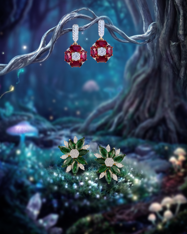 Welcome to our Celestial Garden, blooms awakened by the cosmos, unfolding in radiant rubies, flourishing in lush emeralds and shimmering with an eternal stardust brilliance, capturing a timeless dance of nature and the infinite.